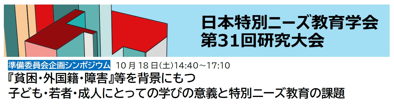 日本特別ニーズ教育学会第31回研究大会開催のお知らせ 本学会加盟の日本特別ニーズ教育学会の第31回研究大会が開催されますのでお知らせ致します。 (詳細は↑画像をクリック) 【日時】 令和7年10月18日(土)9:20~17:10・19日(日)9:00~16:30 【会場】 芦屋大学 六麓荘キャンパス 本館5号館2階 【参加費】 正会員 5000 円 臨時会員(一般) 6000 円 学部・大学院生 3000 円 高校生以下 無料(抄録配布なし) (2025年10月6日更新)