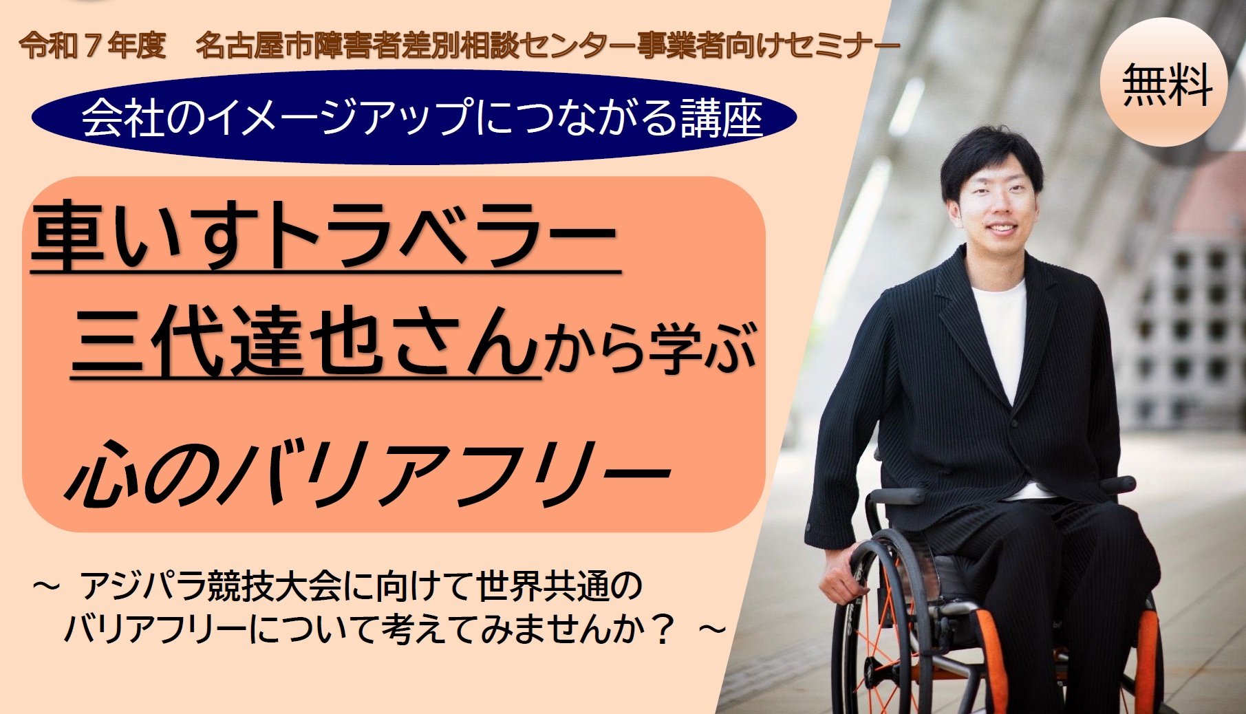 名古屋市障害者差別相談センター主催セミナーの案内 名古屋市障害者差別相談センター事業者向けセミナーの案内 2026年第20回アジア競技大会を目前に、パラスポーツのバリアフリーについてセミナーが開催されますのでお知らせ致します。 詳細は↑画像をクリック 期日:2025年11月21日(金) 時間:14:30~16:30 場所:ういんくあいち 1204号室 開催方法:ハイブリッド形式(対面&オンライン) 定員:50名(来場参加のみ)