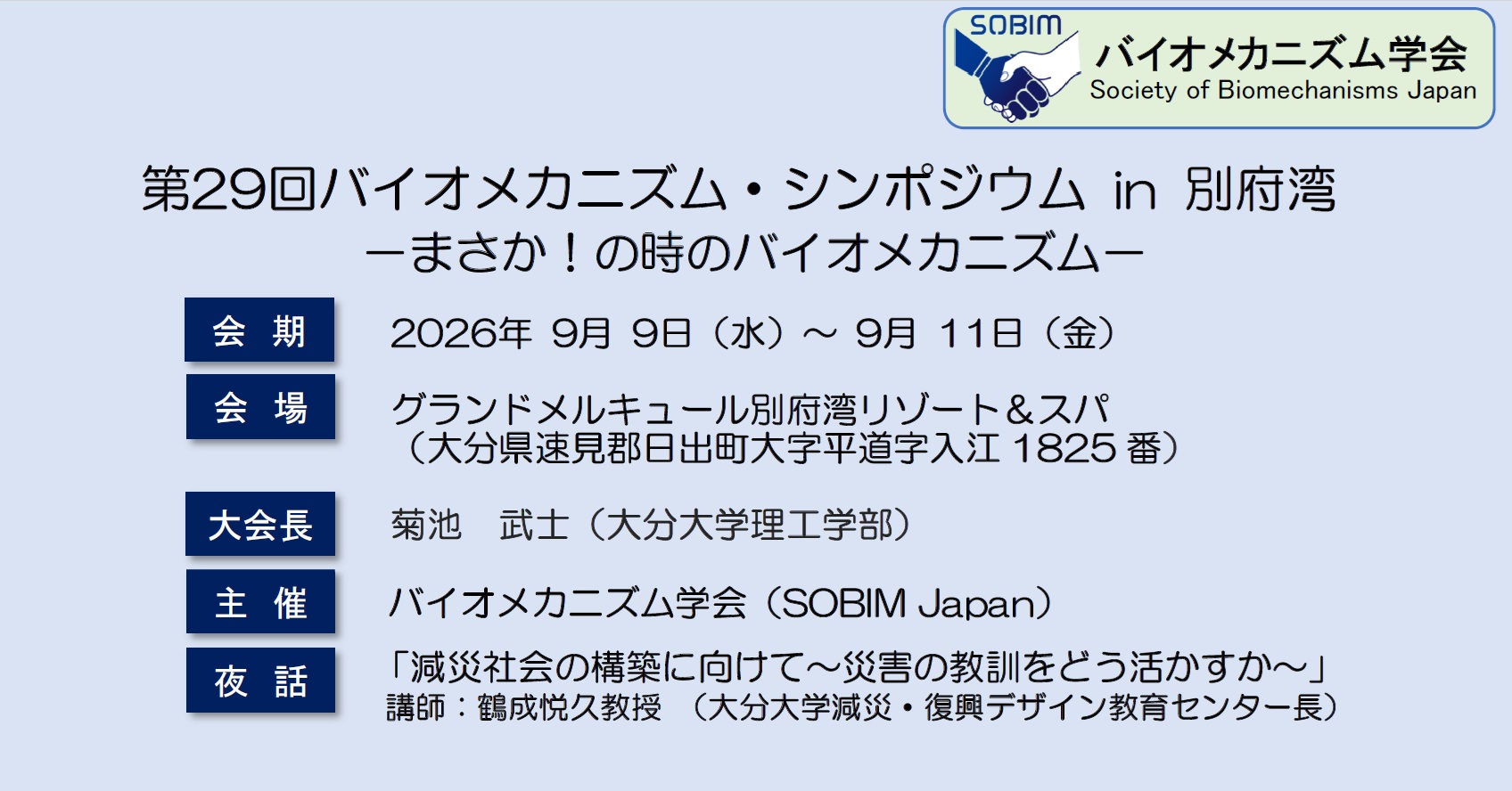2026年9月9日(水)から11日(金)の3日間、第29回バイオメカニズム・シンポジウムを、グランドメルキュール別府湾リゾート&スパにて開催いたします。